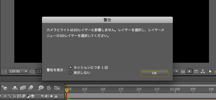 ライト効果を適用したいレイヤーが3Dレイヤーになってない場合はこのような警告ダイアログがでてきます。ライト効果を適用させるには、ライトレイヤーを作成する前か後で3Dレイヤーにしてやる必要があります。
