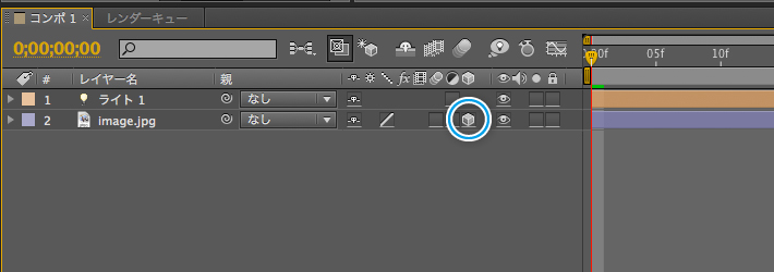 「タイムラインパネル」のライト効果を適用したいレイヤーの「3Dレイヤー」ボタンを押し、3Dレイヤーにします。