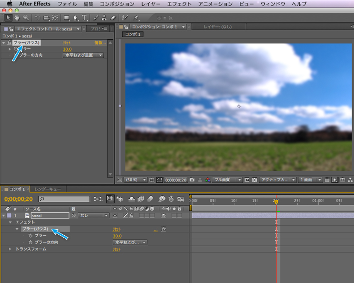 エフェクトが削除されると、「エフェクトコントロールパネル」、「タイムラインパネル」のレイヤーからエフェクトの情報が削除されます。「コンポジションパネル」にもエフェクトの効果がなくなったのが確認できると思います。