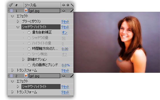 両方のレイヤーに、「エフェクト」→「色調補正」→「シャドウ・ハイライト」を適用します。