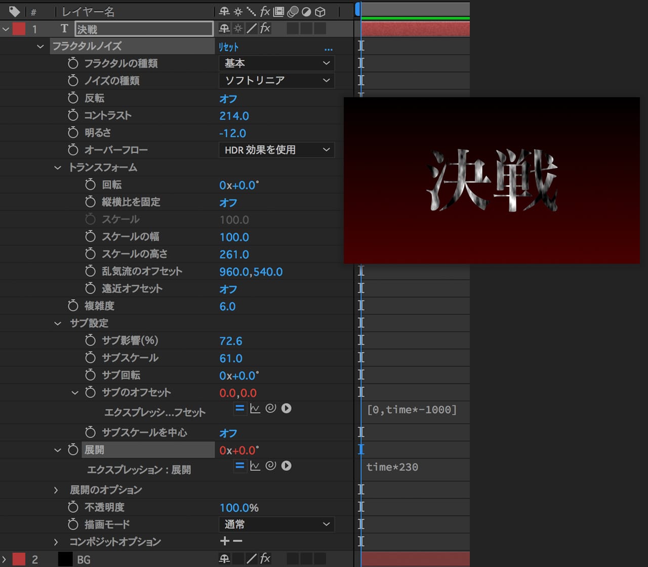 さきほどのテキストレイヤーにエフェクト「フラクタルノイズ」を適用し、画像を参考に値を設定します。