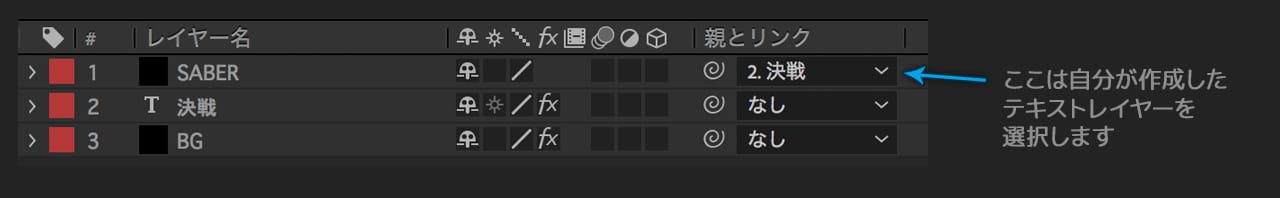 後々にテキストを動かしたりするときのために、テキストレイヤーを親に設定しておきます。