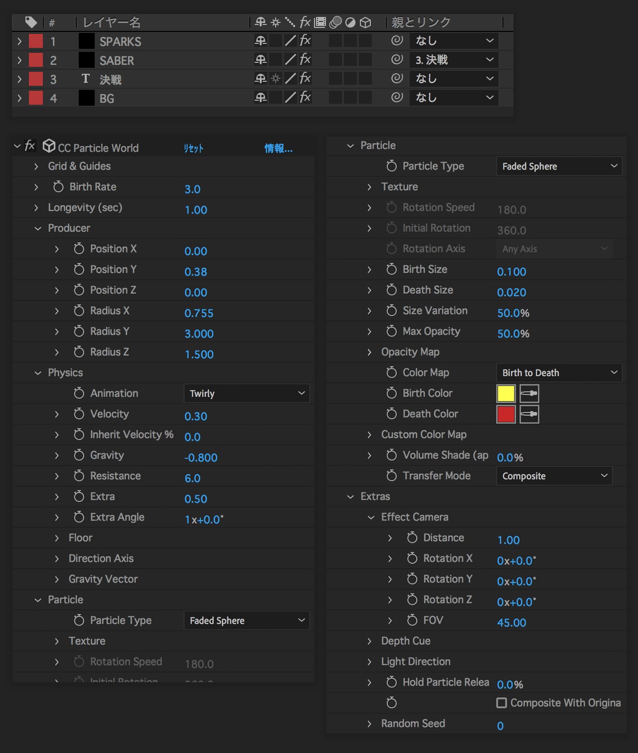 作成したレイヤーにエフェクトの「CC Particle World」を適用し、画像を参考に値を設定します。