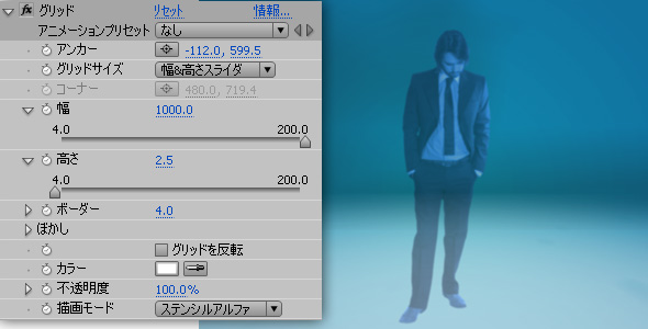 次に、「グリッド」を適用し、走査線を表現します。画像の値を参考に好みの走査線の数にしてください。