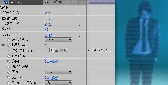 映像の乱れを表現するために、「波形ワープ」を適用します。そして「波形の高さ」にエクスプレッションを適用します。