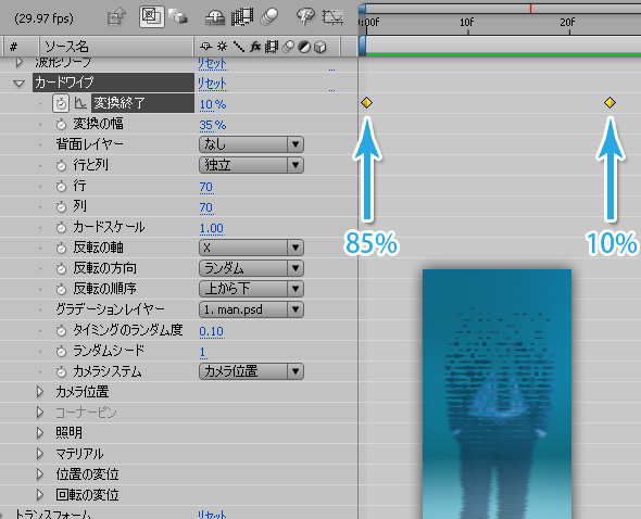 「カードワイプ」の、「変換終了」を調整し、パラパラと出現するようにします。画像の数値は参考です。素材に合わせて調整してください。
