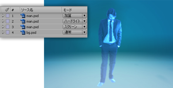 次に、人の素材レイヤーを複製し、レイヤーのモードを上から「加算」「ハードライト」「スクリーン」に変更します。
