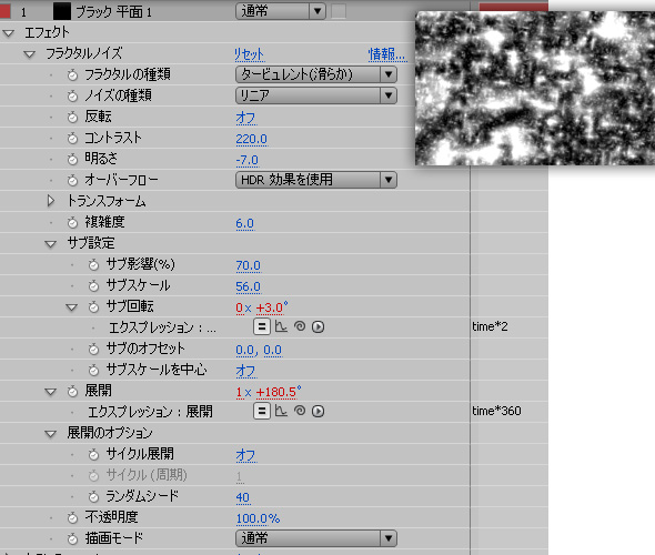 新規平面を作成し、「エフェクト」→「ノイズ&グレン」→「フラクタルノイズ」を適用します。