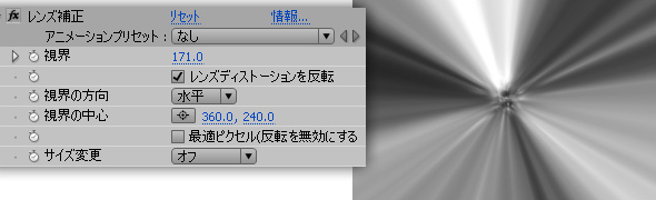 「エフェクト」→「ディストーション」→「レンズ補正」を適用します。
