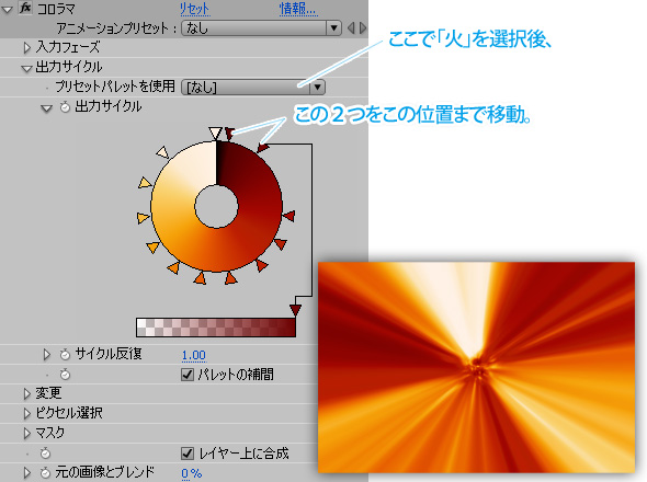 「プリセットパレットを使用」から「火」を選択し、「出力サイクル」を図中のように移動させます。