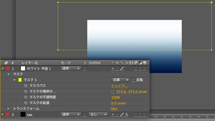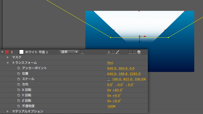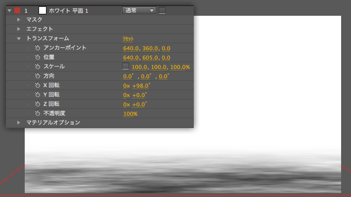 「ground」コンポジションの中の平面レイヤーのトランスフォームを画像の値に変更します。