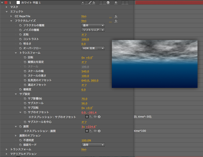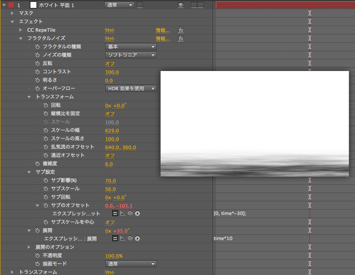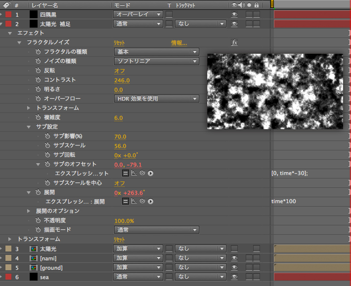 「フラクタルノイズ」の値とエスクプレッションを参考画像のように変更します。
