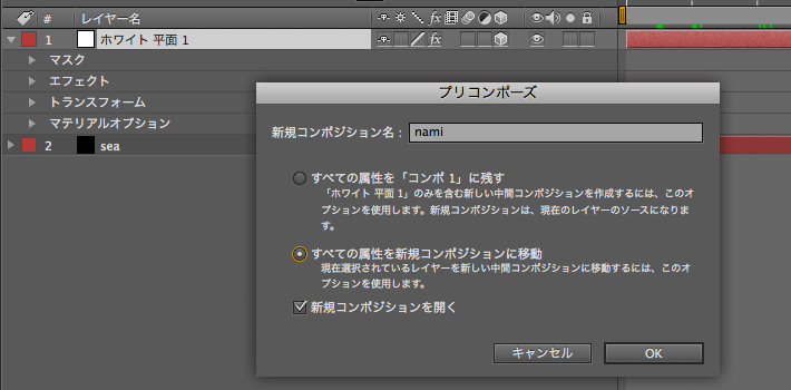 先ほどの波部分を作ってたレイヤーをプリコンポーズします。ここでは分かりやすいように「nami」と名づけておきます。