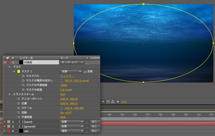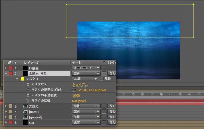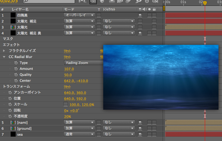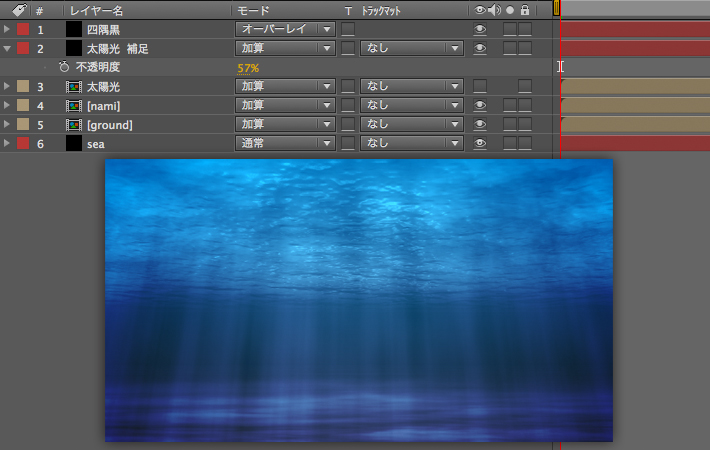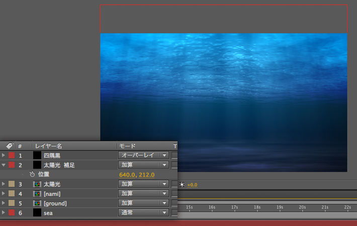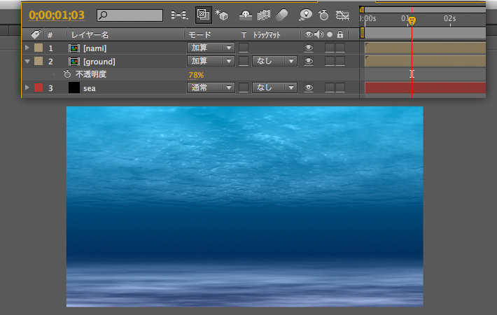 このあと作る地面も差す太陽光もこの「nami」コンポジションを元に作ります。そうすることで海面の波の動きと光の動き、地面の光の反射の動きが近くなりリアル感が増します。