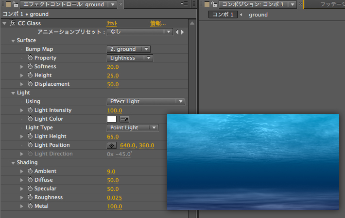 先ほど配置した「ground」レイヤーに「CC Glass」エフェクトを適用し値を参考画像のように変更します。