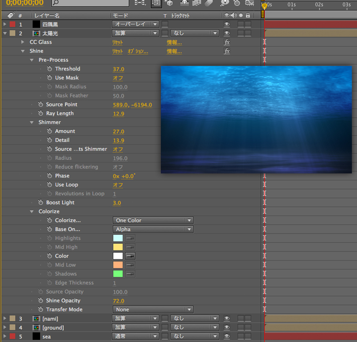 次に差し込む光を作っていきます。「nami」レイヤーを複製し、「Trapcode Shine」エフェクトを適用し値を参考画像のように変更します。プレビューしてもらえれば分かりますが、この光は波の動きにあわせて光も手前に流れてきてくれます。