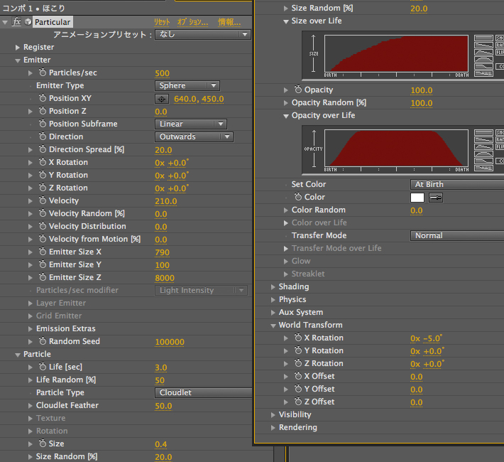 新規平面レイヤーを作成し、「Trapcode Particular」エフェクトを適用し値を調整します。