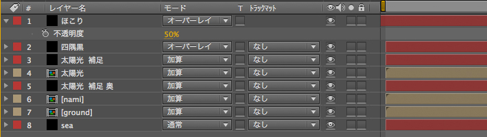 「ground」コンポジションをメインのコンポションに配置し、レイヤーモードを「加算」に変更します。