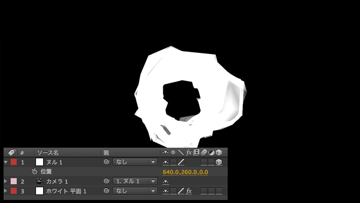 さらにヌルオブジェクトレイヤーは3Dレイヤー設定にし、非表示にしておきます。