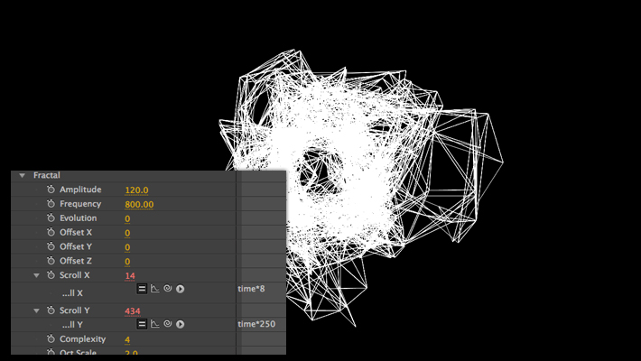 次に動きを付けていきます。Mirエフェクトの「Fractal」パラメーターの「Scroll X」「Scroll Y」にそれぞれエクスプレッションを適用します。