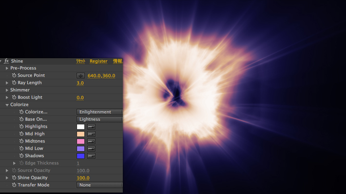 最後に「Trapcode Shine」を適用し、パラメーターを調整して完成です。