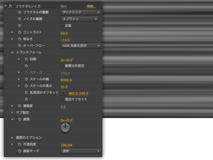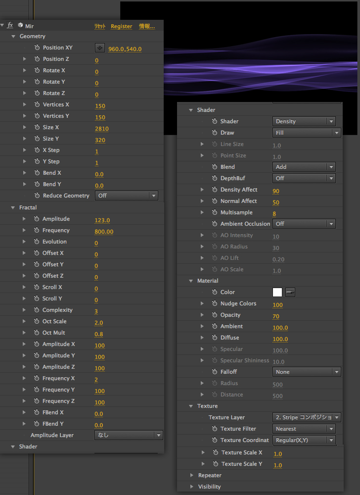 続いて「Trapcode Mir」のパラメータをどんどん設定していきます。