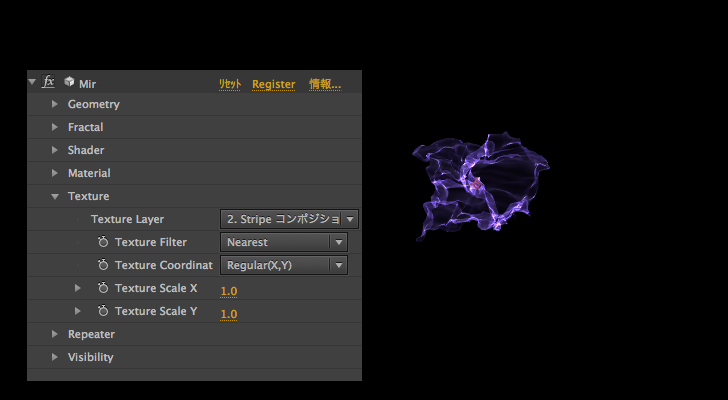 「Trapcode Mir」エフェクトの「Texture」パラメータにある「Txture Layer」に、さきほどプリコンポーズした「Stripe コンポジション 1」レイヤーを選択します。