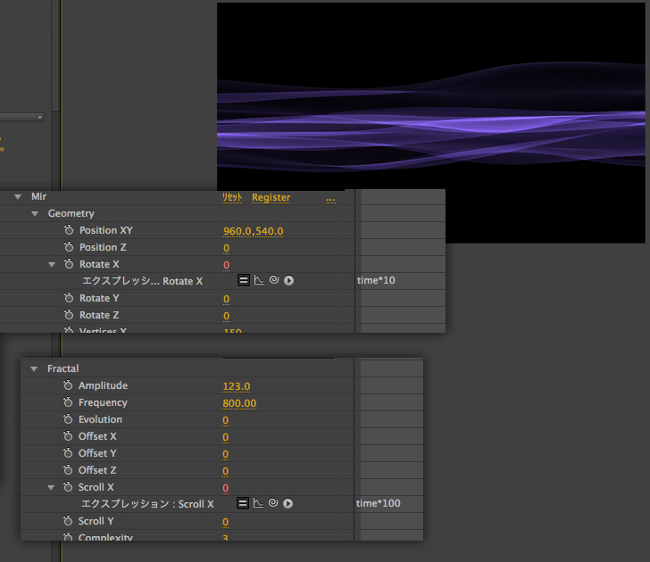 「Trapcode Mir」の「Geometry」の中の「Rotate X」と「Fractal」の中の「Scroll X」にエクスプレッションを記述します。「Rotate X」のエクスプレッション