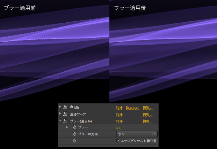 「波形ワープ」の影響でラインにジャギーが発生してるので、それをエフェクトの「ブラー(滑らか)」を使って滑らかにします。