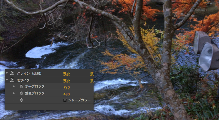 次にエフェクトの「モザイク」を適用し、擬似的に解像度を荒くします。