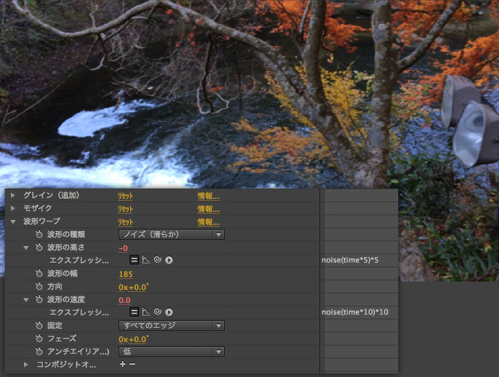 そして「波形の高さ」「波形の速度」にはエクスプレッションを記述します。「波形の高さ」のエクスプレッション