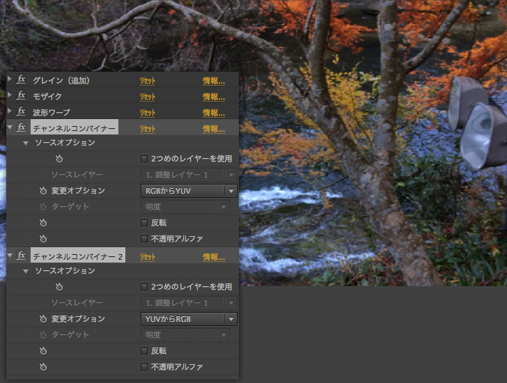 次にエフェクトの「チャンネルコンバイナー」を適用し、「変更オプション」を「RGBからYUV」へ変更します。