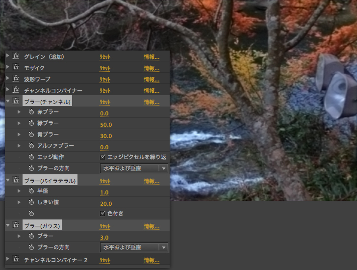 「ブラー(チャンネル)」「ブラー(バイラテラル)」「ブラー(ガウス)」を適用し、パラメータを調整します。