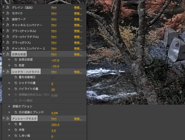 映像素材によっては「アンシャープマスク」を適用しない方が良い感じになりますのでお好みで適用してください。