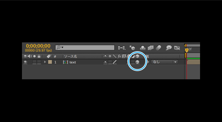 さきほどプリコンポーズした「text」レイヤーを3DレイヤースイッチをONにし、3Dレイヤー化します。
