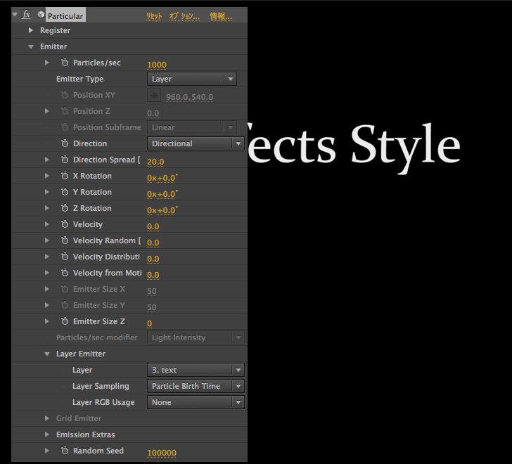 パーティクルの発生源をテキストから発生させたいので、「Emitter」の「Emitter Type」を「Layer」に変更し、「Layer Emitter」の「Layer」でさきほどプリコンポーズした「text」レイヤーを選択します。