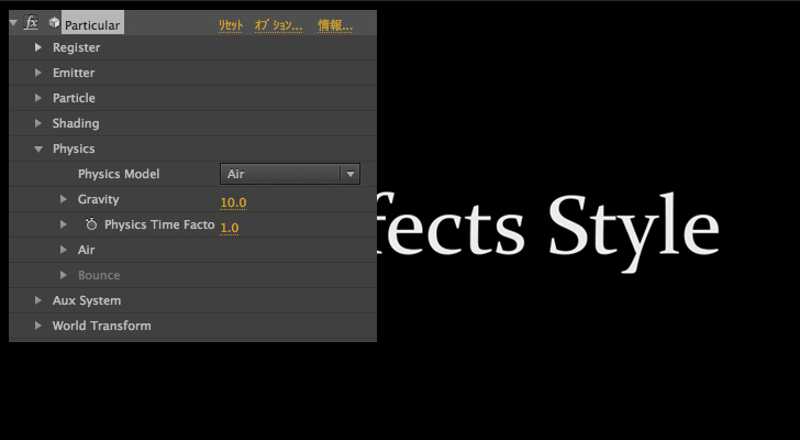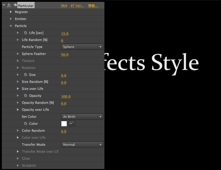 さきほど作った平面レイヤーにエフェクト「Trapcode Particular」を適用します。