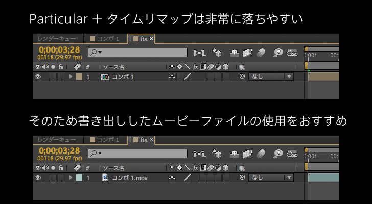 そしてこの入れた「コンポ 1」にエフェクトを適用していくのですが、タイムリマップを使用していくため非常にAfter Effectsが落ちやすくなります。そのため、できれば「コンポ 1」を一度ムービーに書き出してそちらを使用するのがおすすめです。