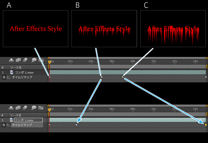 「タイムリマップ」を適用し、最初にスッと垂れる位置(B)、そこから最終的な垂れ位置(C)にキーフレームを打ちます。好みでお好きな位置でかまいません。