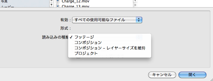 ファイルを読み込むときに出てくる、ファイル読み込みの種類の「フッテージ」と「コンポジション」ですが、明確な違いは、「フッテージ」は指定したファイルを一枚の画像として読み込み、「コンポジション」はファイルのレイヤー構造を保持して読み込むといった違いです。