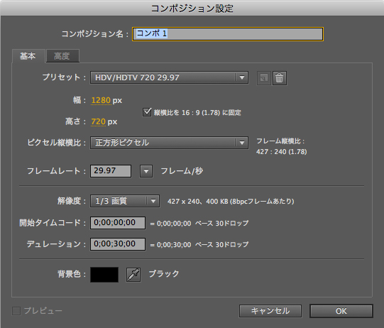 BASIC OPERATION | 2007.12.02(Update: 2013.09.22) コンポジションの背景色を変更する [コンポジション設定]からダイアログを開き背景色を変更することができます。 広告掲載について