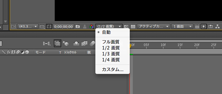 CS4以上のバージョンでは「自動」という項目があり、これはコンポジションのパネルのビューのサイズに合わせて自動的に最適な解像度に合わせてくれます。例えばビューのサイズを50%にすると解像度を「1/2画質」にしたときと同様の解像度にしてくれます。