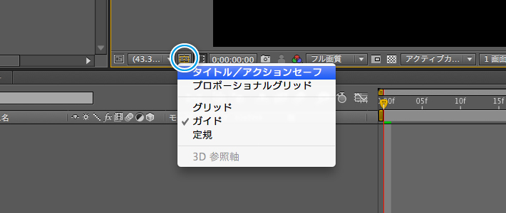 「コンポジションパネル」下部にある画質の「グリッドとガイドのオプションを選択」ボタンを押すと、メニューが出てきますので、「タイトル / アクションセーフ」をクリックして、チェックを入れます。