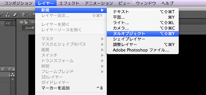 [レイヤー]メニューの中の[新規]→[ヌルオブジェクト]を選択します。