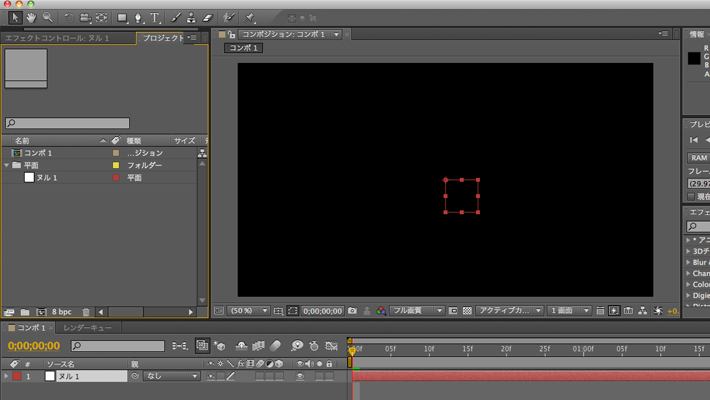例えば、複数のレイヤーに同じ動きを付けたいときなど、ひとつひとつのレイヤーのトランスフォームプロパティを変更していかなくても、「ヌルオブジェクトレイヤー」を使えば、一括で複数のレイヤーを操作することもできます。