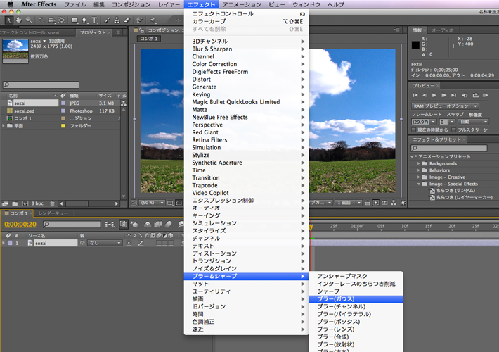 エフェクトを適用したいレイヤーを選択し、[エフェクト]メニューの中から今回は[ブラー&シャープ]→[ブラー(ガウス)]を使用してみます。