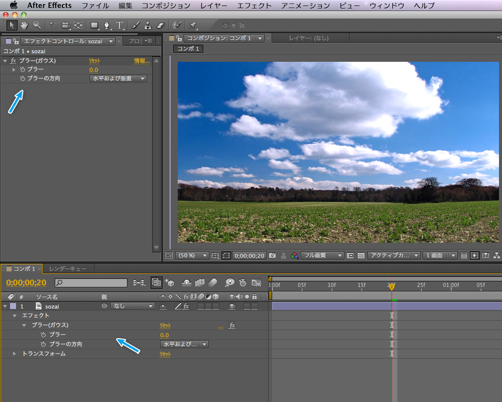 エフェクトが適用されると、「エフェクトコントロールパネル」、「タイムラインパネル」のレイヤーに適用したエフェクトの情報が表示されます。今は「ブラー(ガウス)」エフェクトの「ブラー」の値が「0.0」になっているため、コンポジション画面でも何も変化が起こっていません。