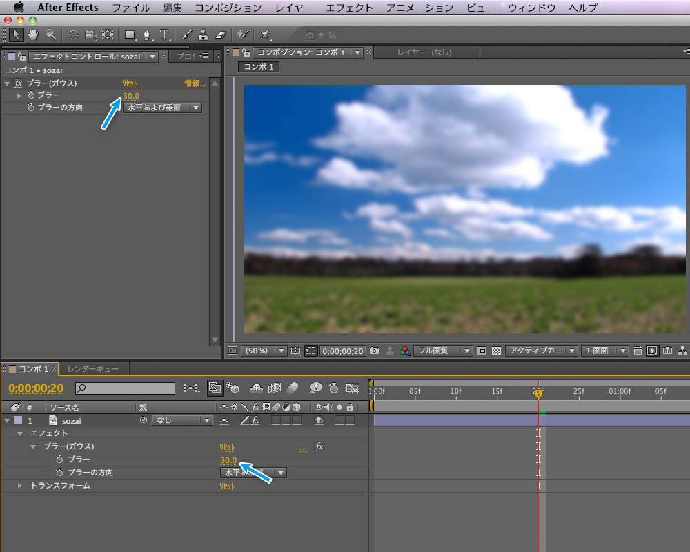 画像は「ブラー(ガウス)」エフェクトの「ブラー」の値を「30.0」にしてみました。画像にぼかし効果が適用されているのが確認できます。「コンポジションパネル」でもエフェクトの変化が確認できたはずです。