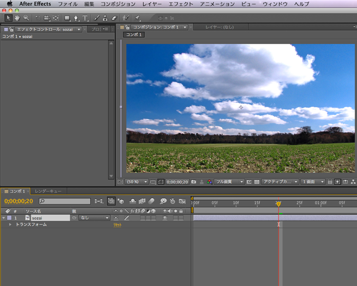 エフェクトが削除されると、「エフェクトコントロールパネル」、「タイムラインパネル」のレイヤーからエフェクトの情報が削除されます。「コンポジションパネル」にもエフェクトの効果がなくなったのが確認できると思います。