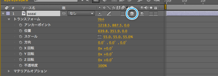 3Dレイヤーに変換すると、位置、アンカーポイント、スケールのプロパティに奥行き(Z)値が追加され、さらに、「X回転」、「Y回転」、「Z回転」、「マテリアルオプション」が追加されます。
